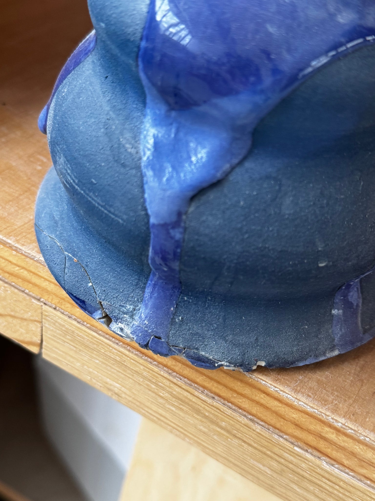 Wazon przez spłynięte szkliwo podczas wypału miał odpryski na dole, które były dosztukowywane i klejone. Nadaje się do użytkowania.